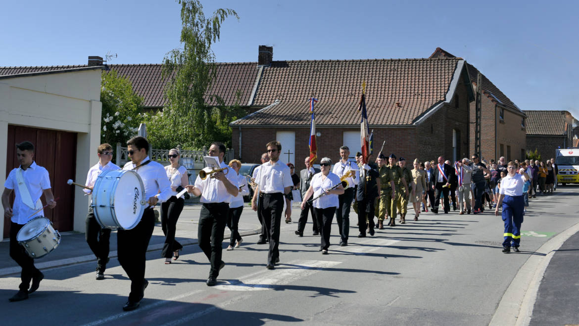 Emmené par l’harmonie municipale, l’association du képi au casque en tenue militaire, l’association de la FNACA, les élus, les secouristes, les enfants des écoles accompagnés par leurs professeurs, le cortège s’est rendu aux deux monuments aux morts de la commune puis à la salle des fêtes.