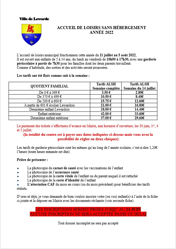 Les dossiers d’accueil de loisirs sans hébergement seront distribués ce jour dans la classe de nos écoliers Lewardois.Ils sont également disponibles en mairie.