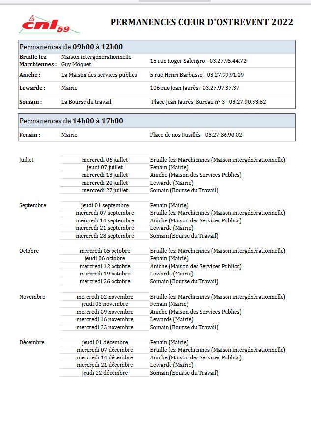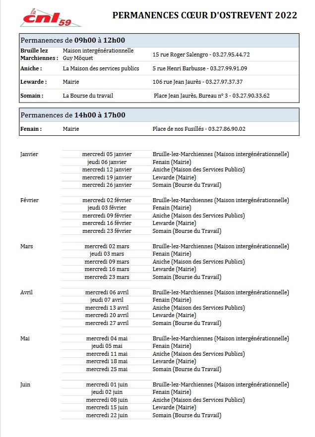 Calendrier des permanences 2022 de la Confédération Nationale des Logements