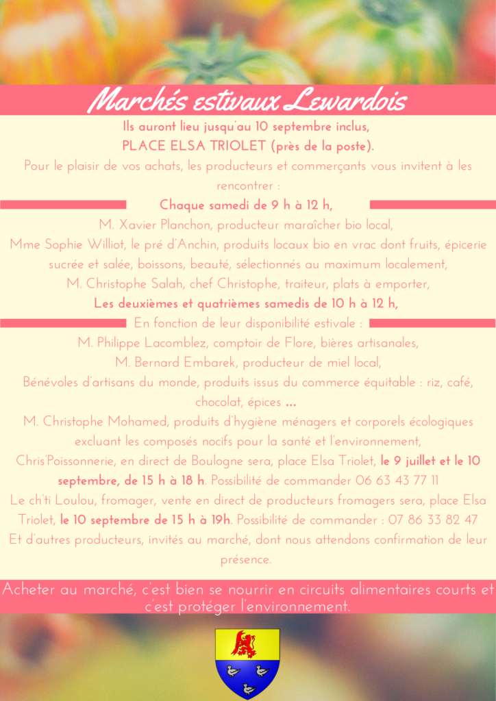 « Tous les Évènements Cet évènement est passé. Marchés estivaux – chaque samedi du 2 juillet au 10 septembre 2 juillet 2022 @ 09:00 - 10 septembre 2022 @ 12:00 « Concours des jardins fleuris Brocante du 14 juillet » Ajouter au calendrier Google Agenda iCalendar Outlook 365 Outlook Live Détails Début : 2 juillet 2022 @ 09:00 Fin : 10 septembre 2022 @ 12:00 Organisateur Mairie de Lewarde Lieu Place Elsa Triolet Place Elsa Triolet Lewarde, 59287 France + Google Map