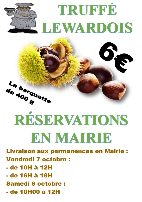 Comme chaque année, il vous est possible de réserver le truffé Lewardois (à la châtaigne) en mairie. Vous pourrez ainsi venir le chercher en avant-première en mairie aux dates et horaires ci-dessous. Le truffé sera ensuite vendu lors de la brocante du 9 octobre, le stand se tiendra près du boulodrome.