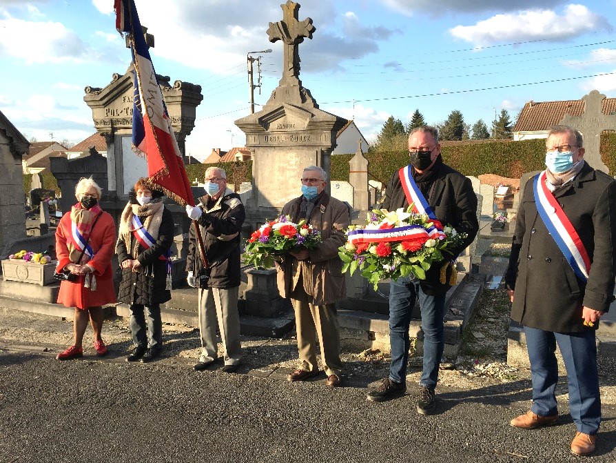 A 18 h, Mesdames Jeanne-Marie Delmaire, Nina Lahssen, Adjointes au Maire, Monsieur Denis Michalak, Maire, Monsieur Alain Bruneel, Député du Nord, Monsieur Plutot, Président de la FNACA ont déposé des gerbes de fleurs aux monuments aux morts, place des Martyrs et cimetière.