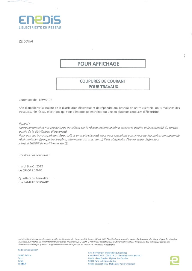 Enedis nous informe de probables coupures d’électricité dans la rue Famille Dervaux ce mardi 9 août entre 9h et 14h. About mairie de Lewarde