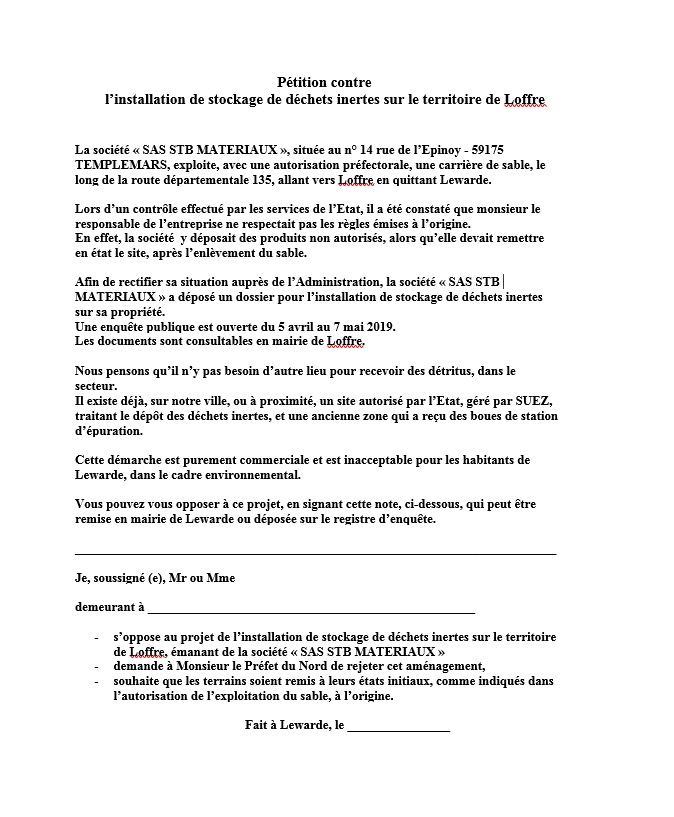 Elle concerne la demande d’exploitation d’une installation de stockage de déchets inerte sur le territoire de la commune de Loffre par la société SAS STB matériaux.