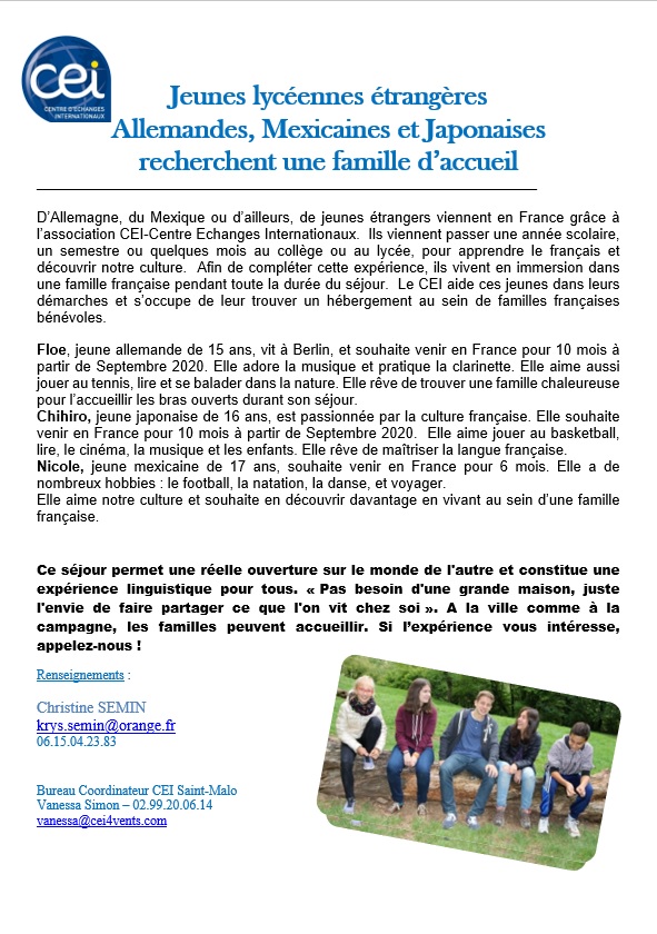Jeunes lycéennes étrangères cherchent une famille d’accueil