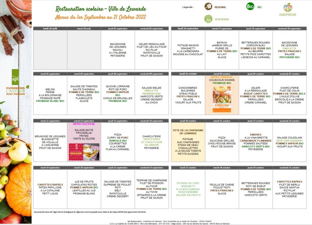 Menu de la cantine du 1er septembre au 21 octobre 2022