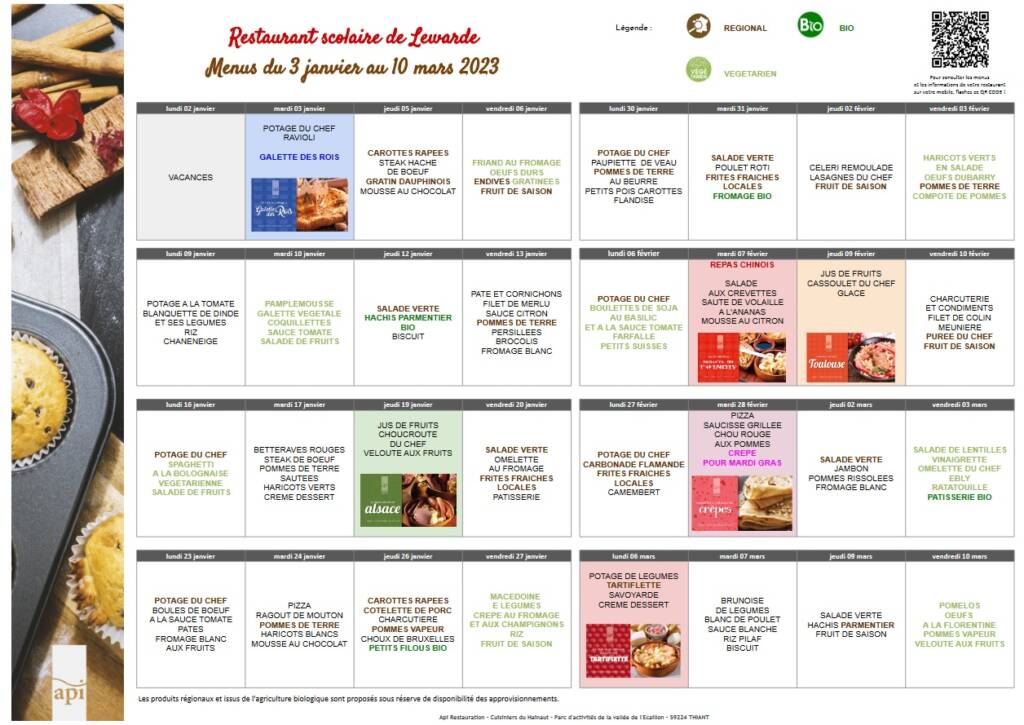 Menu de la cantine du 3 janvier au 10 mars 2023
