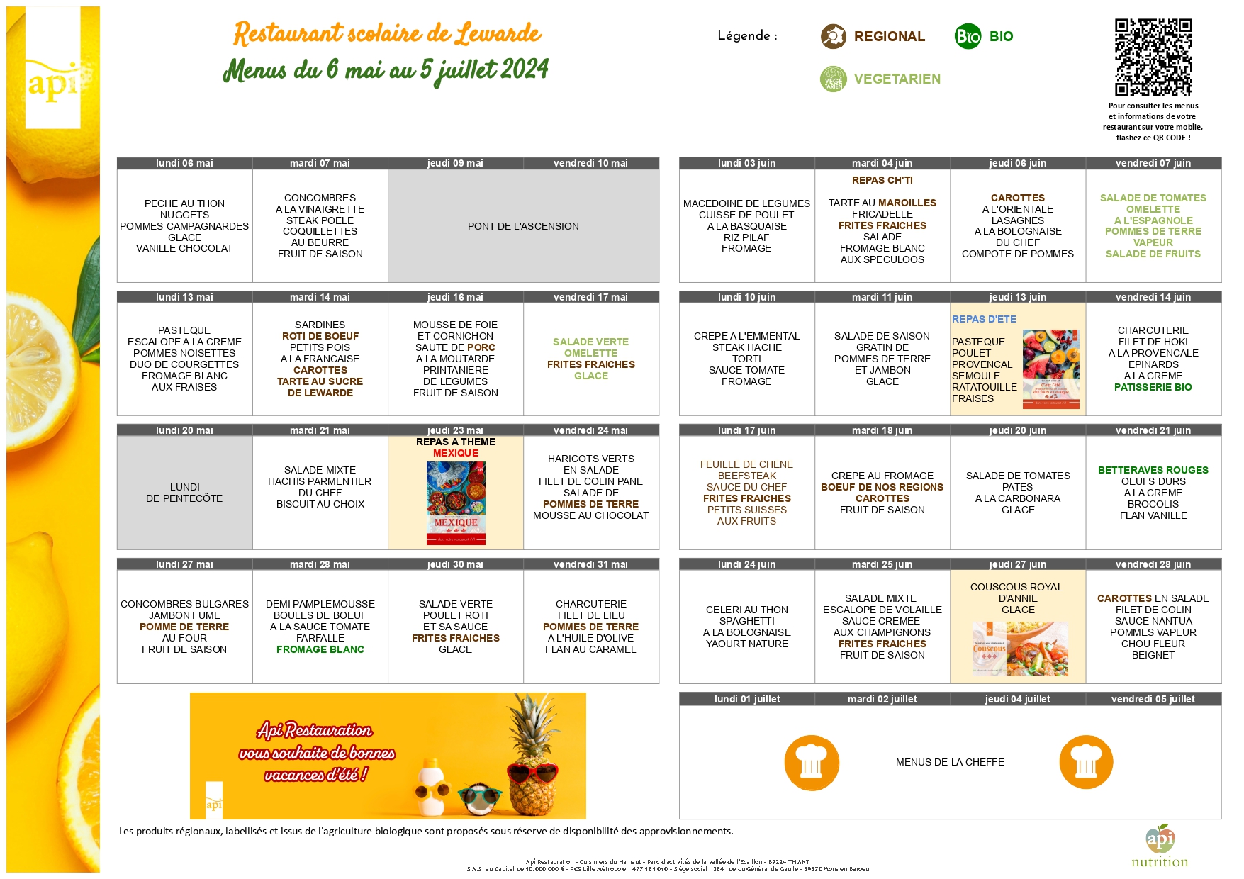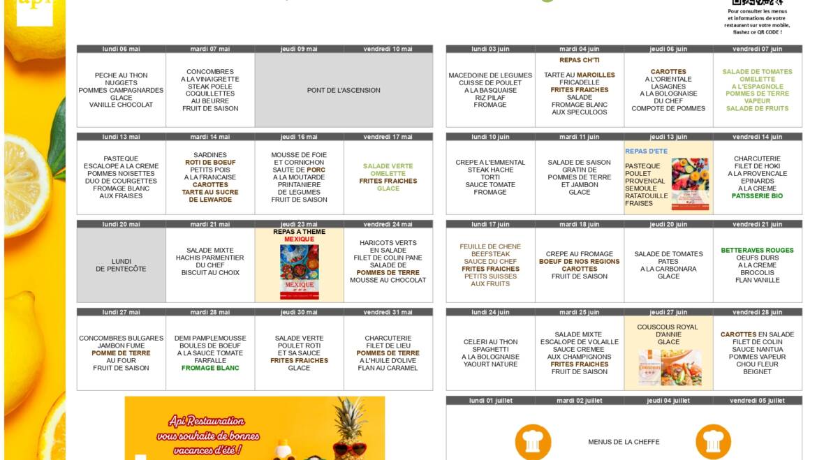Menus de la cantine du 6 mai au 5 juillet 2024