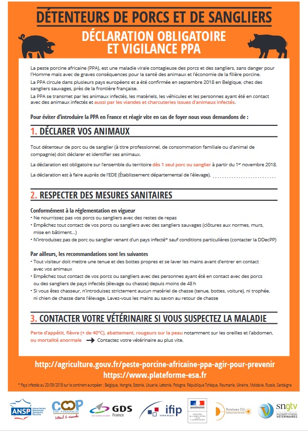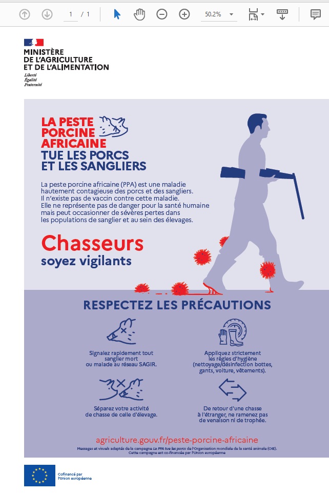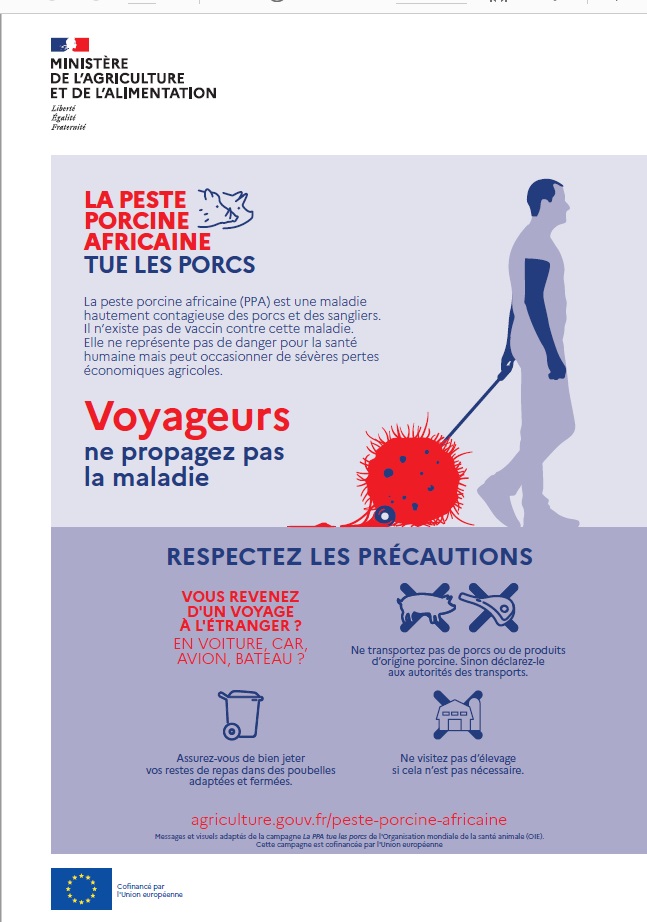 Dès lors, et dans le cadre de la vigilance vis à vis du risque d’introduction du virus de la peste porcine africaine qui sévit actuellement dans plusieurs pays d’Europe, des mesures renforcées de surveillance et de contrôle ont été décidées.