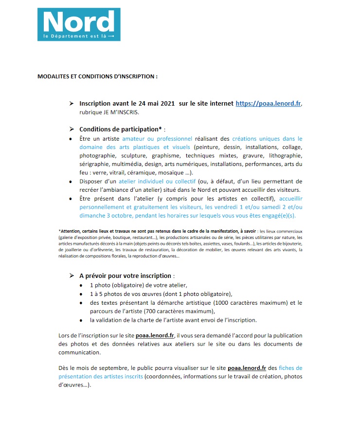 Quelques conditions devront être respectées afin de pouvoir s’inscrire aux Portes Ouvertes des Ateliers d’Artistes :