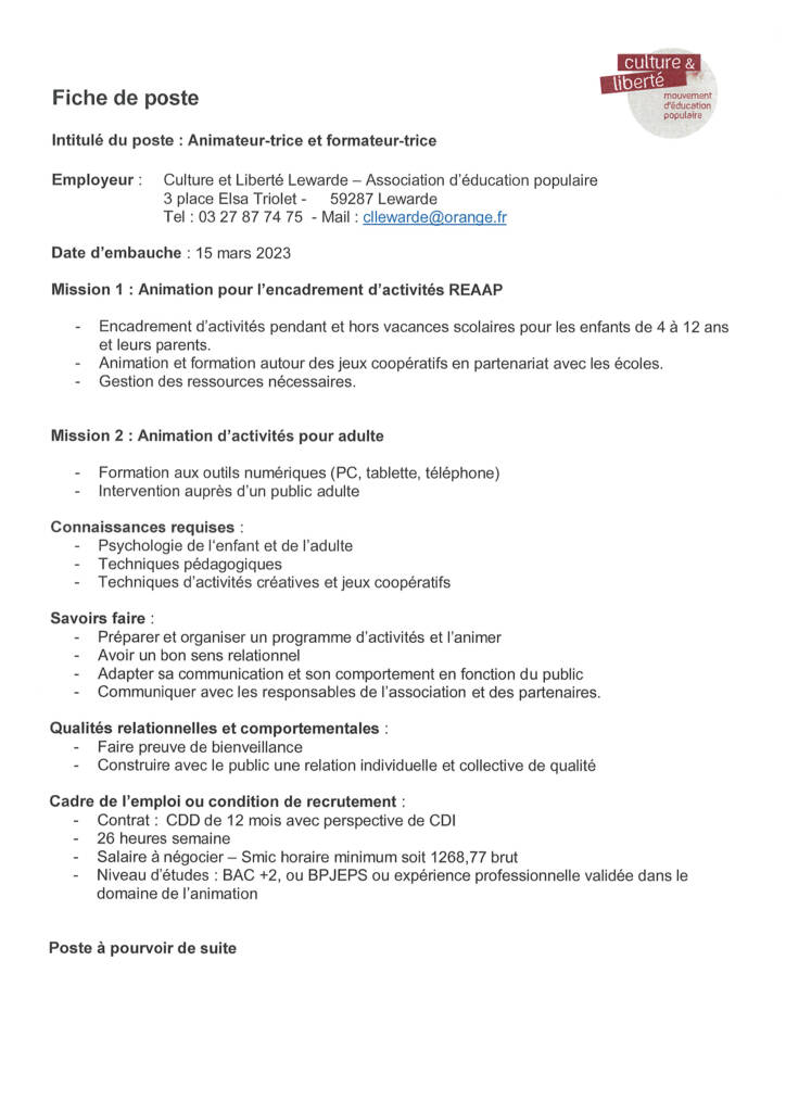 Un poste d’animateur-trice et formateur-trice est proposé à l’association Culture & Liberté, Place Elsa Triolet. Les missions concernant le poste sont ci-joints. About mairie de Lewarde