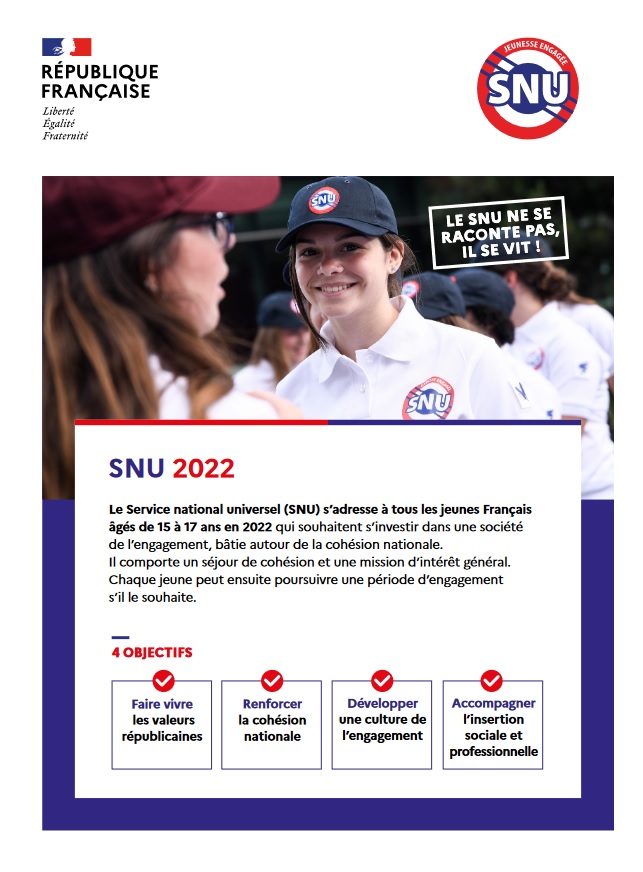 Le Service National Universel (SNU) s’adresse à tous les jeunes français de 15 à 17 ans quelle que soit leur situation scolaire, familiale et sociale. Il comporte 3 étapes : un séjour de cohésion d’une durée de 13 jours, une mission d’intérêt général de 82 heures et un engagement volontaire (facultatif) d’un minimum de 3 mois.Cette année 2 séjours de cohésion sont organisés du :- 12 au 24 juin 2022- 3 au 15 juillet 2022Ces sessions représentent une réelle opportunité pour accueillir de nombreux jeunes, et plus précisément 770 volontaires en juin et 765 en juillet.L’inscription au SNU fait sur la plateforme nationale : snu.gouv.frLes inscriptions seront clôturées le 24 avril 2022 pour le séjour de juin et le 1er mai 2022 pour le séjour de juillet.