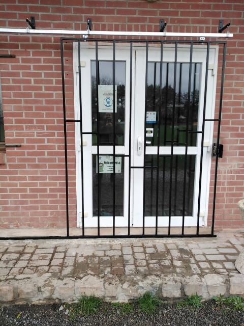 Une grille fabriquée par les services techniques de la ville a été installée sur la façade pour ajouter un élément sécuritaire au lieu et dissuader les actes de délinquance.