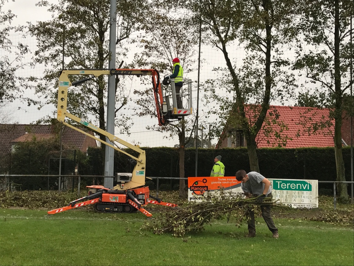 Une entreprise spécialisée, missionnée par la ville, a entrepris l’élagage d’arbres au stade. Ces travaux permettront d’améliorer l’éclairage du terrain d’honneur et de rattacher le « pare ballon » qui était descendu au fil du temps. About mairie de Lewarde